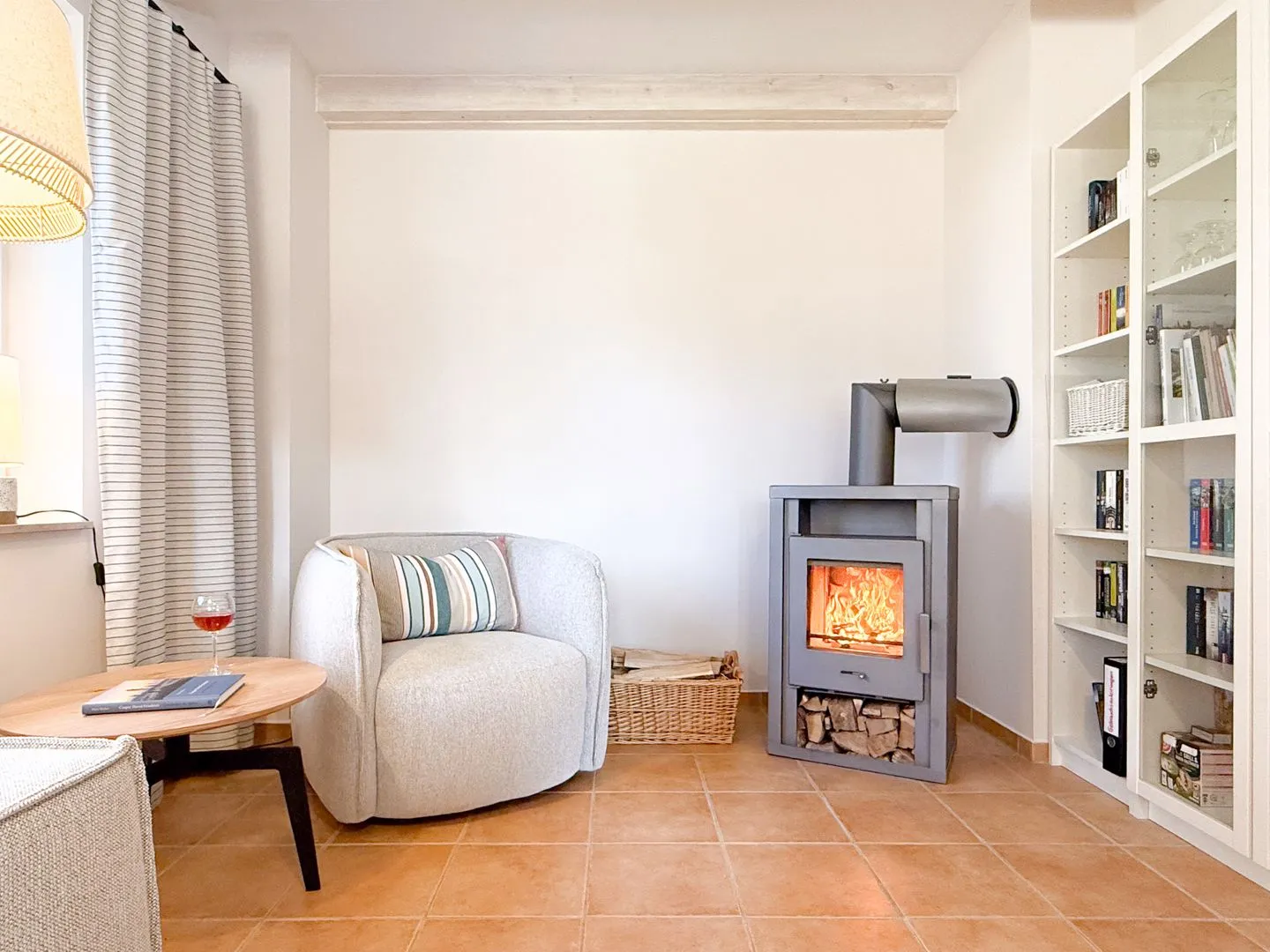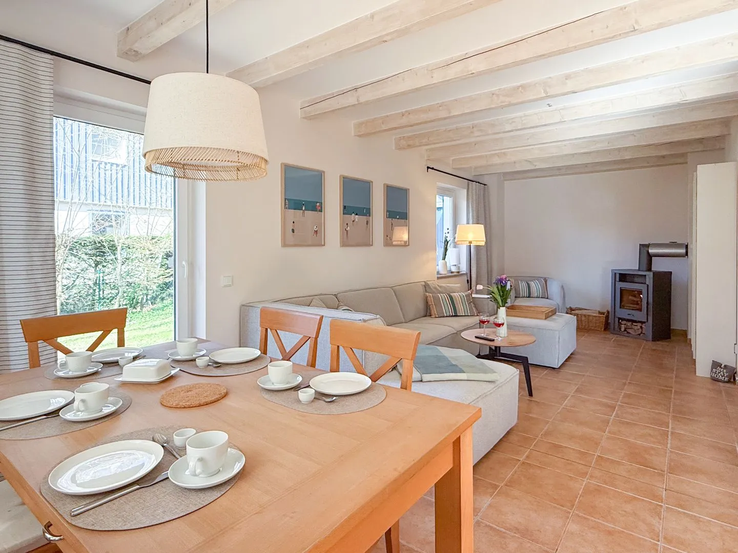 Wohnzimmer mit Sofa, TV, Kaminofen