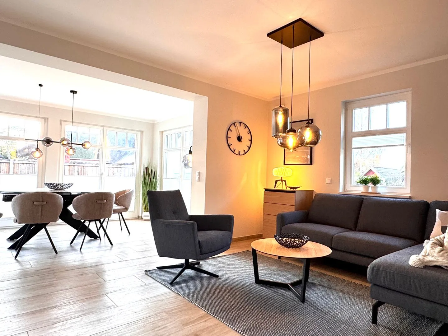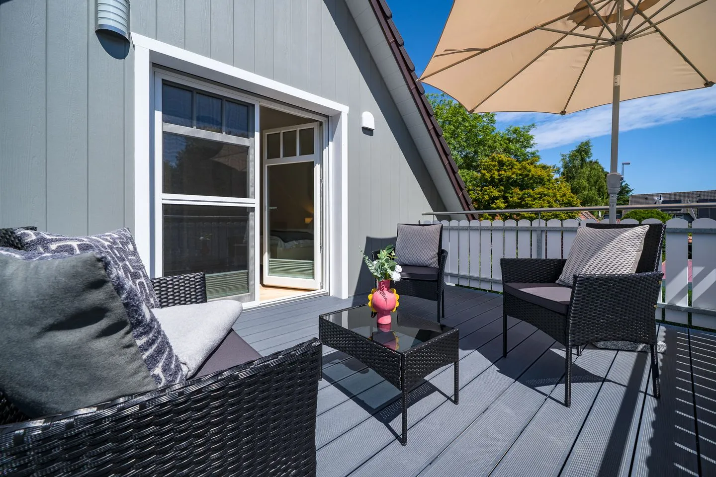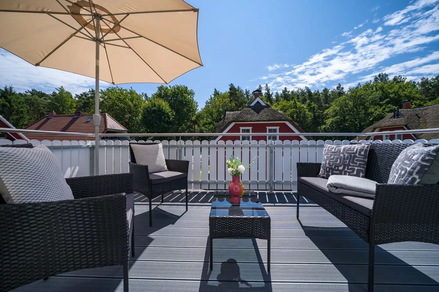 Der Außenbereich lädt mit einem Garten, möblierten Terrassenflächen sowie einem überdachten Balkon zu entspannten Stunden ein. Ein privater Strandkorb steht bereit und die Gartenmöbel laden zum Loungen oder gemeinsamen Essen an der frischen Luft ein. Für Grillliebhaber steht ein Kohlegrill zur Verfügung, an dem Sie kulinarische Abende im Freien verbringen können. Die Sauna des Hauses ermöglicht besonderen Wellnessgenuss, unabhängig vom Wetter. Das abgeschlossene Grundstück gibt Familien mit Kindern sowie Gästen, die Wert auf Privatsphäre legen, zusätzliche Sicherheit und Geborgenheit.
